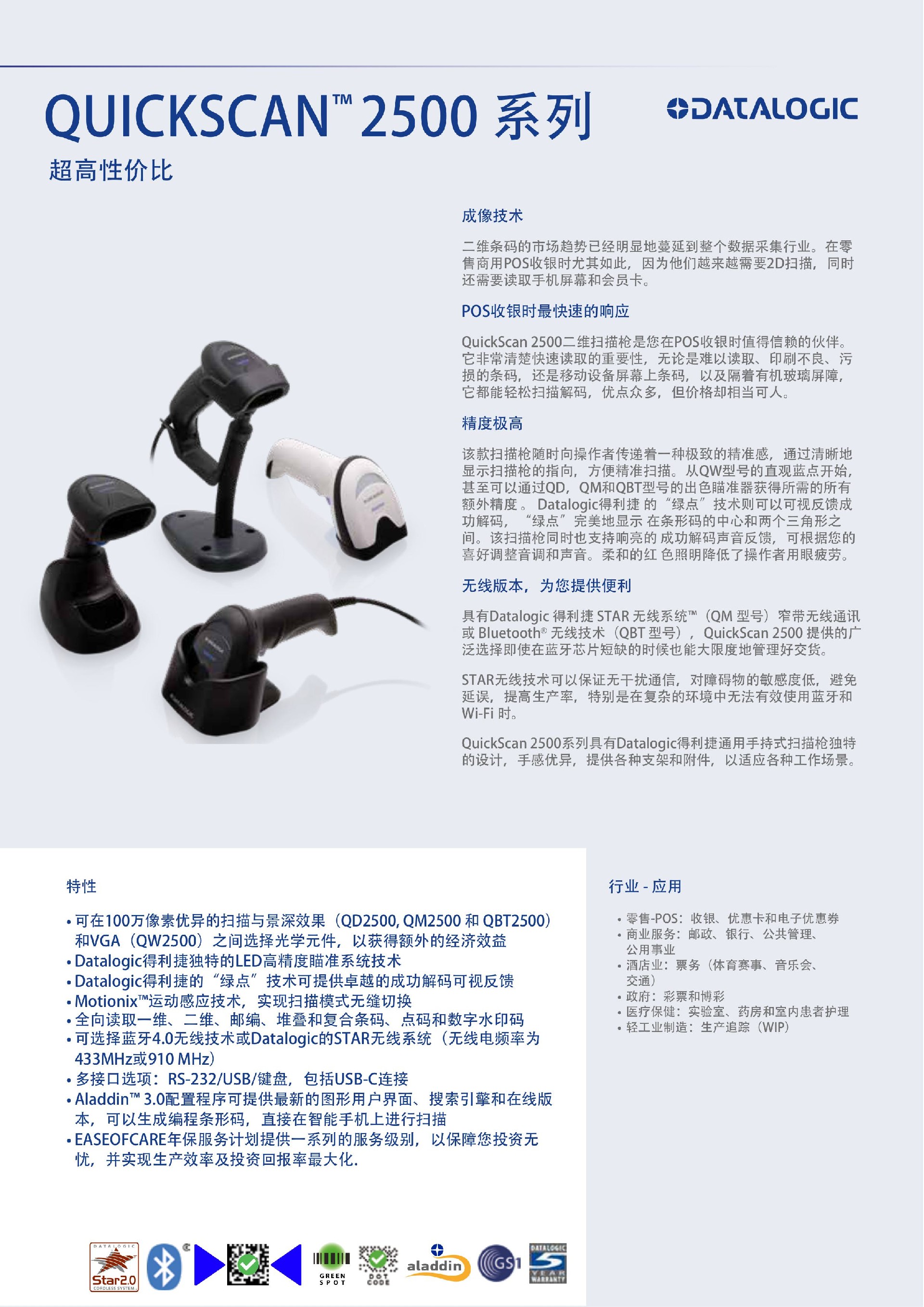 POS收银时最快速的响应 QuickScan 2500二维扫描枪是您在POS收银时值得信赖的伙伴。 它非常清楚快速读取的重要性,无论是难以读取、印刷不良、污 损的条码,还是移动设备屏幕上条码,以及隔着有机玻璃屏障, 它都能轻松扫描解码,优点众多,但价格却相当可人。 精度极高 该款扫描枪随时向操作者传递着一种极致的精准感,通过清晰地 显示扫描枪的指向,方便精准扫描。从QW型号的直观蓝点开始, 甚至可以通过QD,QM和QBT型号的出色瞄准器获得所需的所有 额外精度 。 Datalogic得利捷 的“绿点”技术则可以可视反馈成 功解码,“绿点”完美地显示 在条形码的中心和两个三角形之 间。该扫描枪同时也支持响亮的 成功解码声音反馈,可根据您的 喜好调整音调和声音。柔和的红 色照明降低了操作者用眼疲劳。