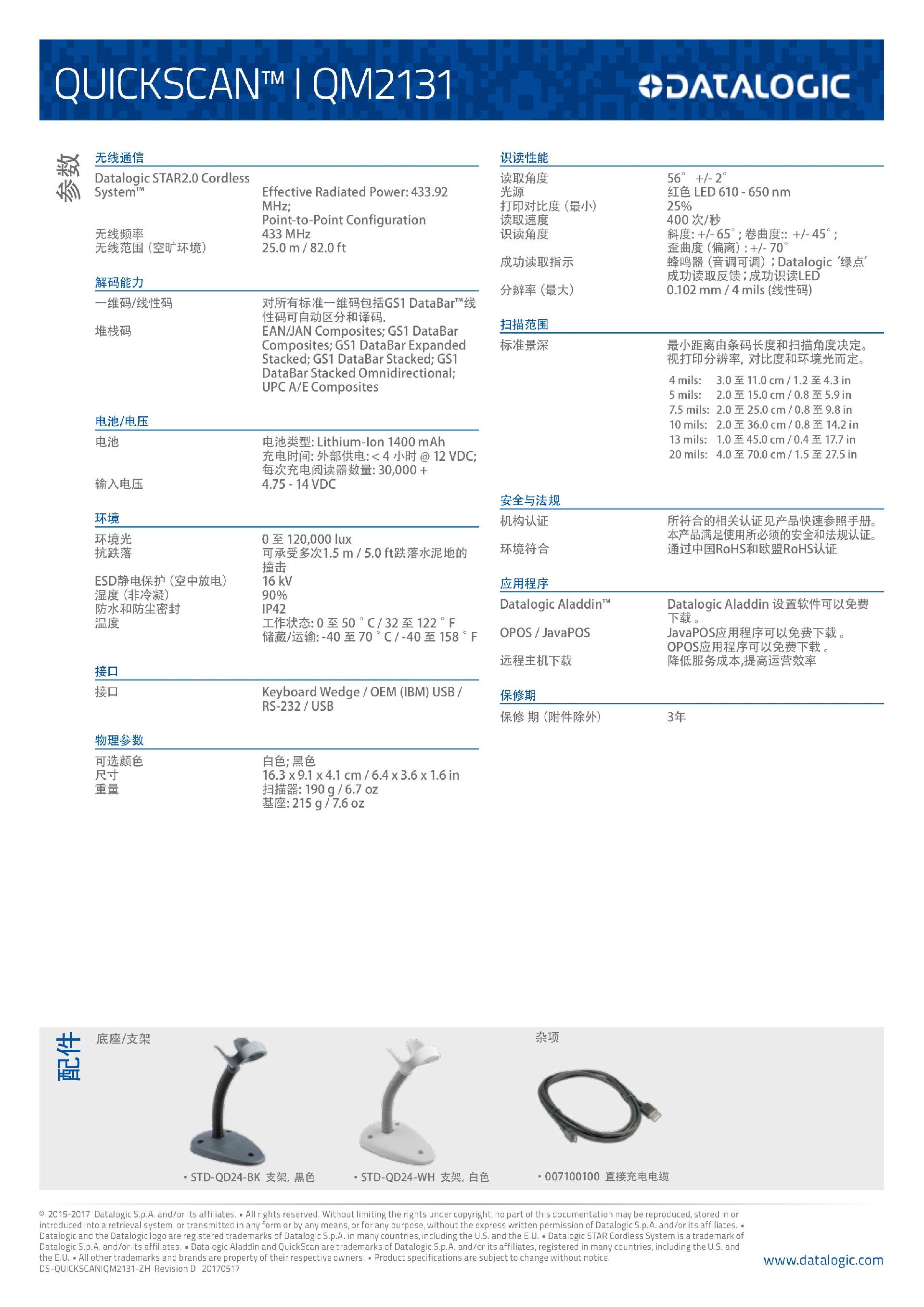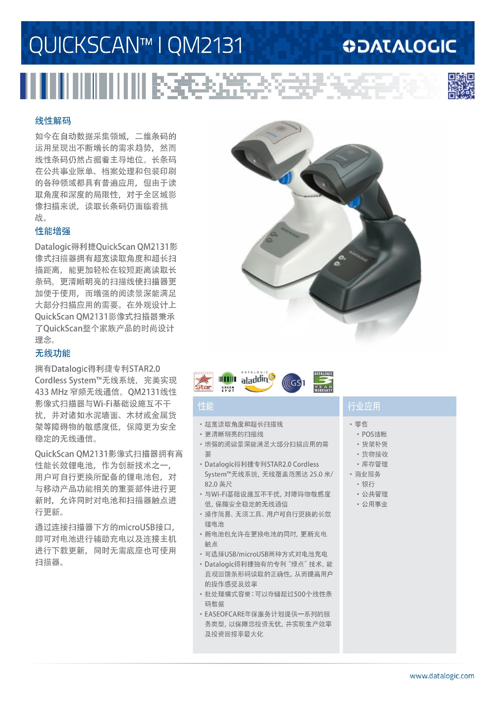 线性解码 如今在自动数据采集领域,二维条码的 运用呈现出不断增长的需求趋势,然而 线性条码仍然占据着主导地位。长条码 在公共事业账单、档案处理和包装印刷 的各种领域都具有普遍应用,但由于读 取角度和深度的局限性,对于全区域影 像扫描来说,读取长条码仍面临着挑 战。 性能增强 Datalogic得利捷QuickScan QM2131影 像式扫描器拥有超宽读取角度和超长扫 描距离,能更加轻松在较短距离读取长 条码。更清晰明亮的扫描线使扫描器更 加便于使用,而增强的阅读景深能满足 大部分扫描应用的需要。在外观设计上 QuickScan QM2131影像式扫描器秉承 了QuickScan整个家族产品的时尚设计 理念。
