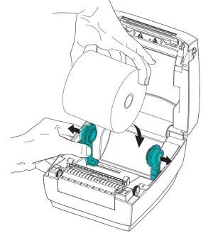 使用另一只手将介质卷支架拉开,将介质卷放在纸卷支架上,并松开。调整成卷介质方向,使其在通过打印 (驱动)辊上方时打印面朝上。